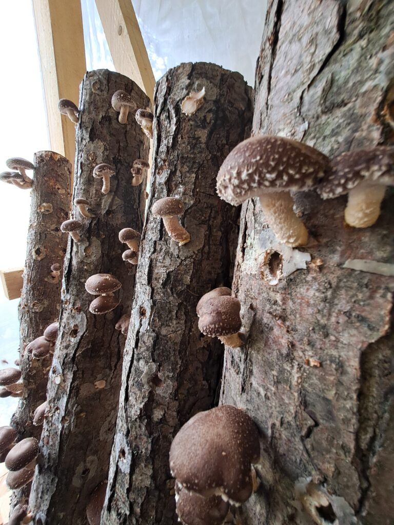 Gemeinsam produzieren wir pro Person 5 Pilzstämme (4 Shiitake Stämme und einen Austernseitlingstamm. Im Laufe der Arbeiten (es ist ganz schön viel Arbeit die Stämme zu produzieren) erfährt ihr Wissenswertes über den Pilzanbau und dazugehörige Geräte. Von den Stämmen kann dann zwei bis vier Mal im Jahr über 3 Jahre geerntet werden. (Erntezeit = Juni bis Oktober) Der Workshop dauert 5 Stunden und – bis auf das Bäume fällen – werden wir uns gemeinsam alle wichtigen Schritte zum Anbau von Pilzen in Stämmen erarbeiten. Alle Teilnehmer:innen bekommen jeweils fünf gemeinsam produzierte Pilzstämme inklusive Kulturanleitung mit nach Hause.
